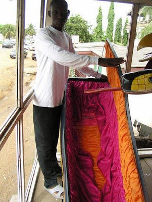 A burial in Ghana is by no means an ordinary one. That's because each coffin is a small art work, reflecting the fantasy of the local craftsmen. The local habit forces the family to spend a lot with the "throne" (coffin) so that to commemorate and tell the life story of the deceased person. Craftsmen around Accra, the capital of Ghana, specialized in making wooden imaginative coffins for this purpose. The coffins usually speak about a detail, a significant fact, a symbol of the dead, illustrating the profession, hobbies, social status of the dead.
